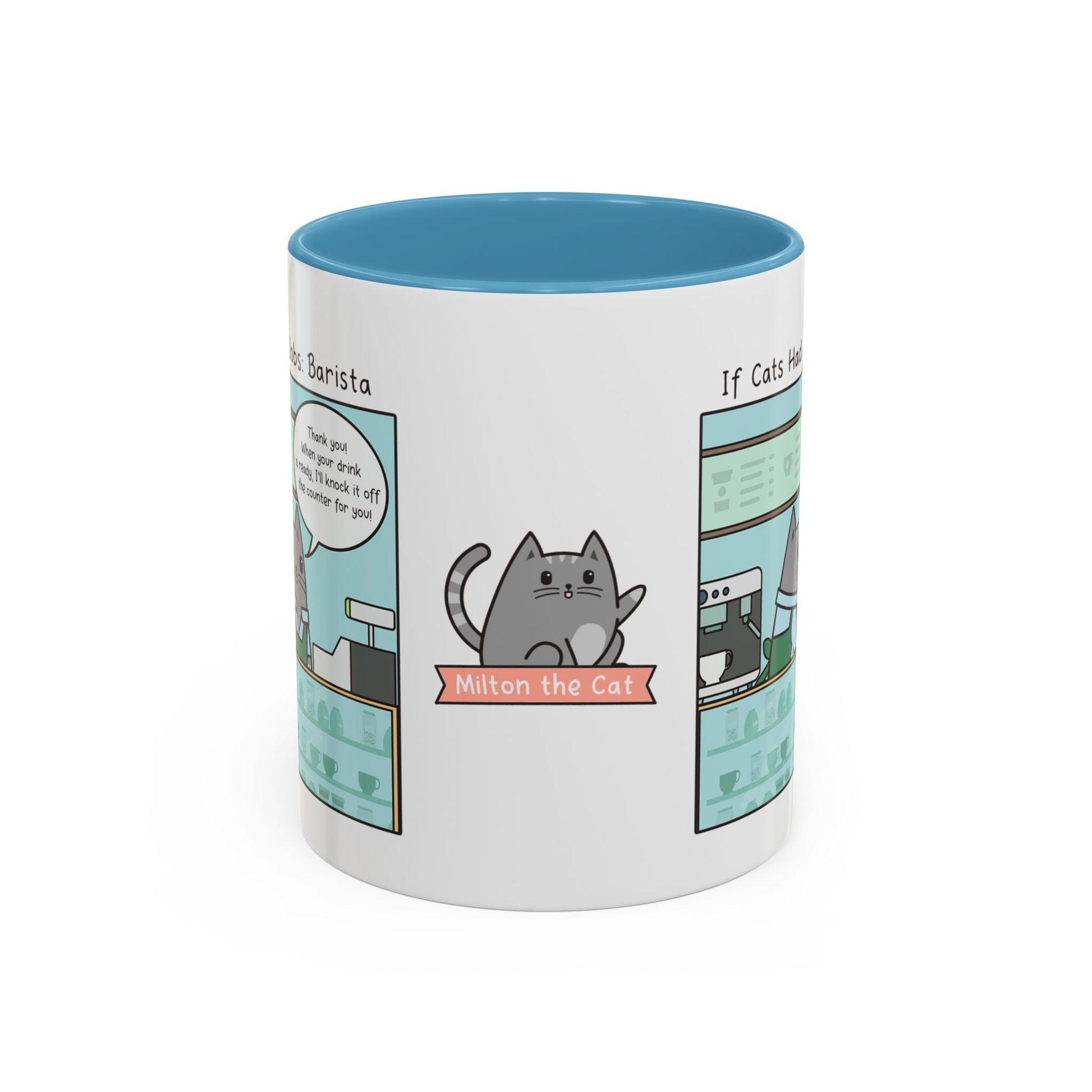 But the real star of this mug is the captivating comic strip starring Milton, the beloved character from the Milton the Cat webcomic. Join this tubby tabby as he takes on the role of a purr-fect barista, brewing up a bit of laughter...if your order ever makes it to you...and we hope you don't mind a bit of cat hair in your coffee.