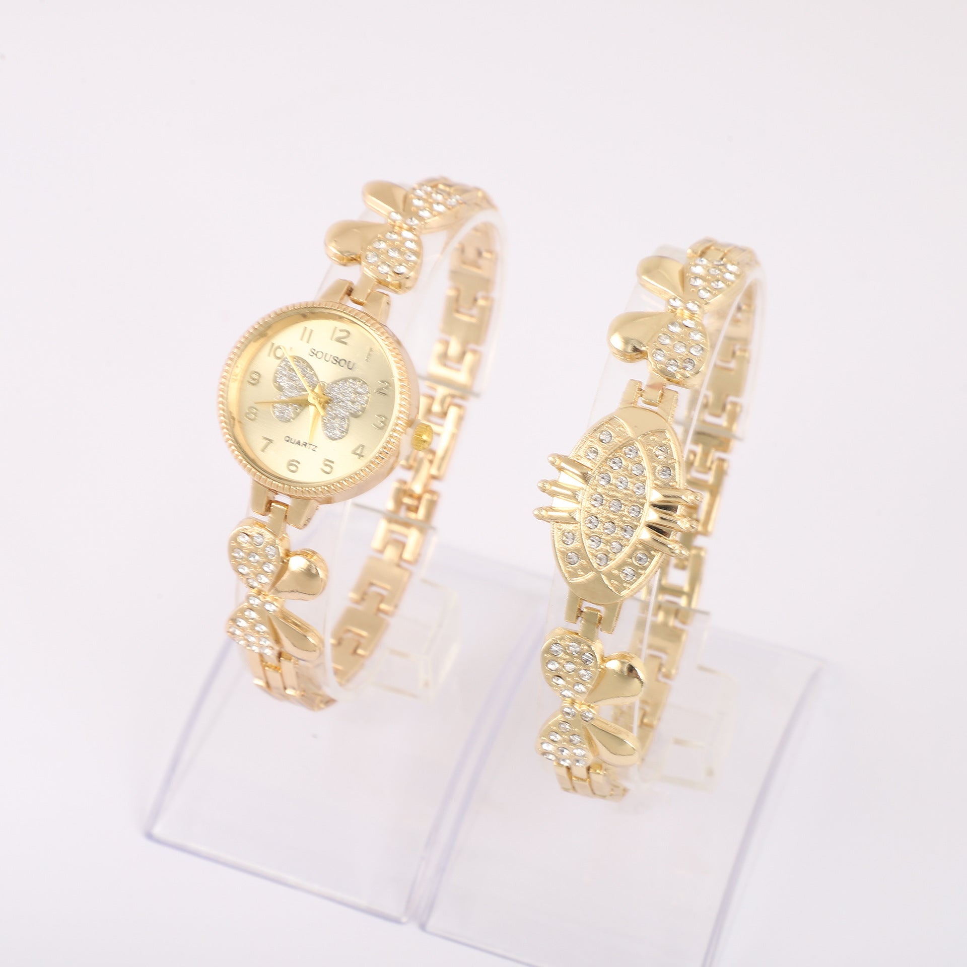 Elevate your style with this exquisite ladies' bracelet watch set, designed for elegance and sophistication. Featuring a round-dial quartz watch adorned with dazzling full-diamond accents and a charming bowknot detail, this timepiece is the perfect blend of fashion and function. Paired with a matching bracelet, this set makes a stunning accessory for both casual and formal occasions.