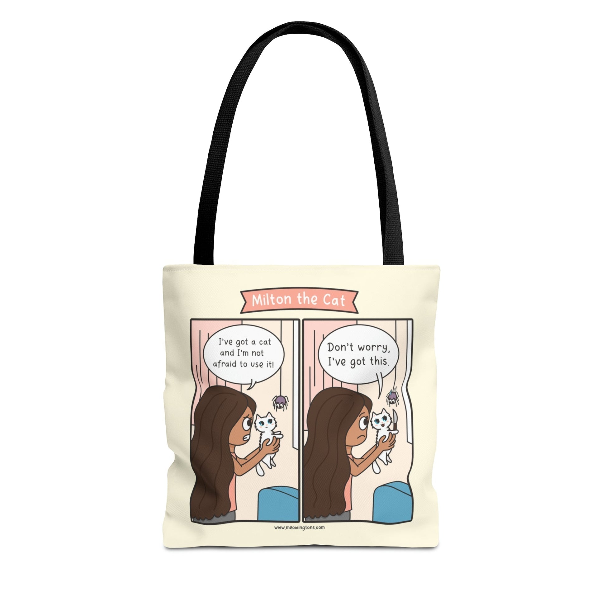 Our ExPURRminator Comic Tote Bag is a must-have from our Milton the Cat Comic Collection! Featuring our beloved sassy tabby and his charming sidekick, Millie, these playful felines steal the spotlight in our webcomic, Milton the Cat. Crafted from durable polyester with reinforced handles, this tote combines style and functionality effortlessly, making it perfect for all your carrying needs.