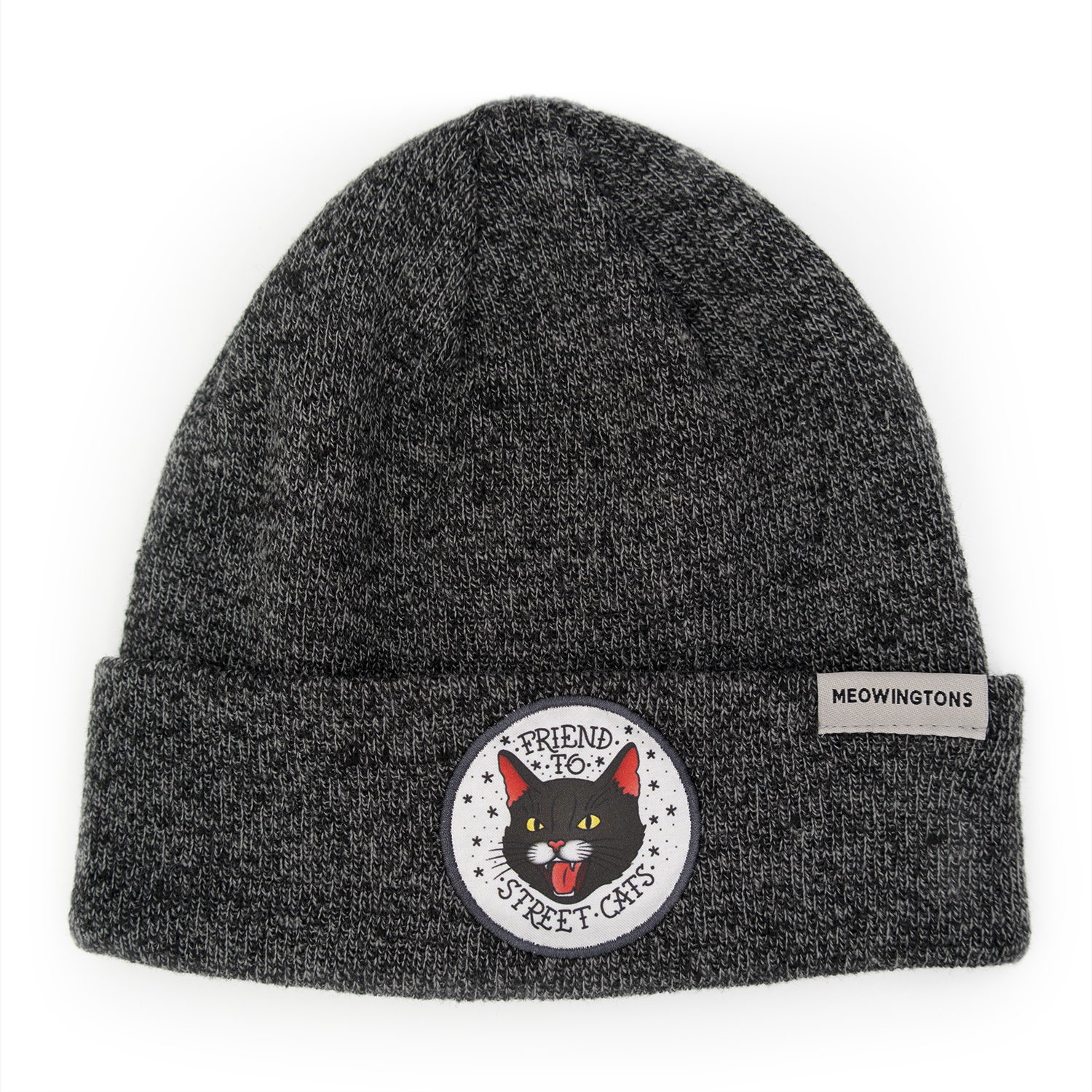 Ready to look cute and rescue cats in style? The Friend To Street Cats Beanie Hat will keep you warm wherever your adventures take you! Inspired by American Traditional tattoos, each hat features a snarling black cat patch with silky embroidered edging on a fold-over cuff.