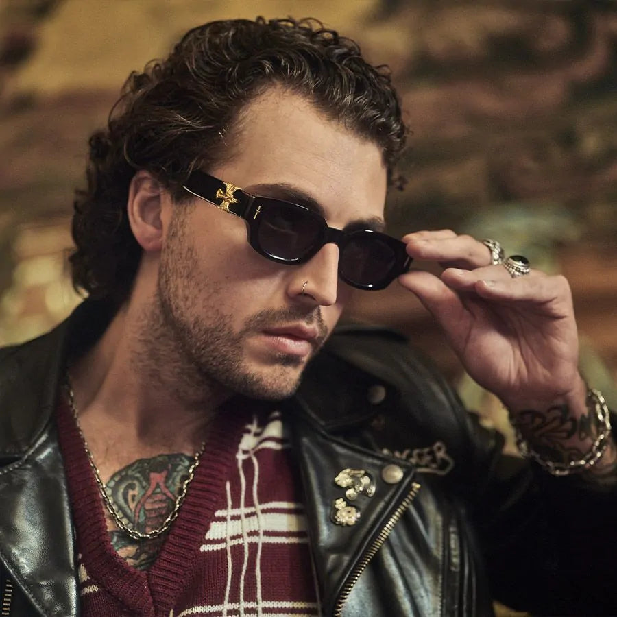 the iconic dagger pins for a truly unique look. Crafted by hand, with a biker frame silhouette, these black and gold sunglasses will elevate any outfit.